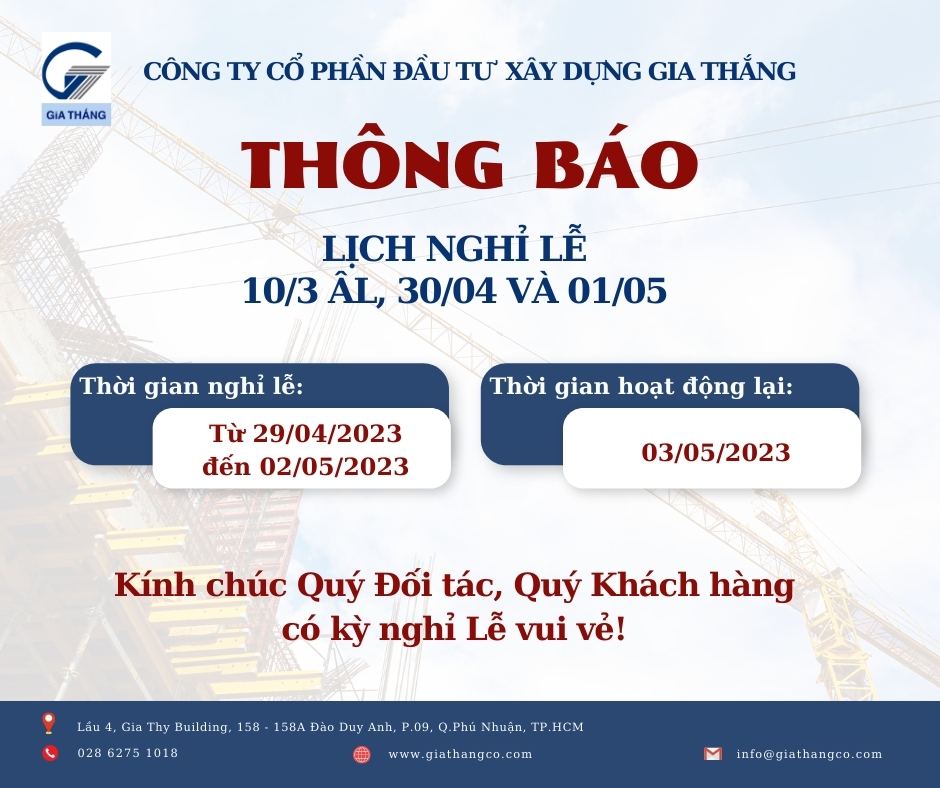 Để thuận lợi cho việc liên hệ, giao dịch trước và sau Lễ giổ tổ Hùng Vương, 30/04, 01/05 năm 2023. Công ty CPĐTXD Gia Thắng xin thông báo đến Quý Đối tác, Quý Khách hàng lịch nghỉ Lễ của Công ty như sau: Thời gian nghỉ Lễ: từ thứ 7, 29/04/2023 đến hết ngày […]